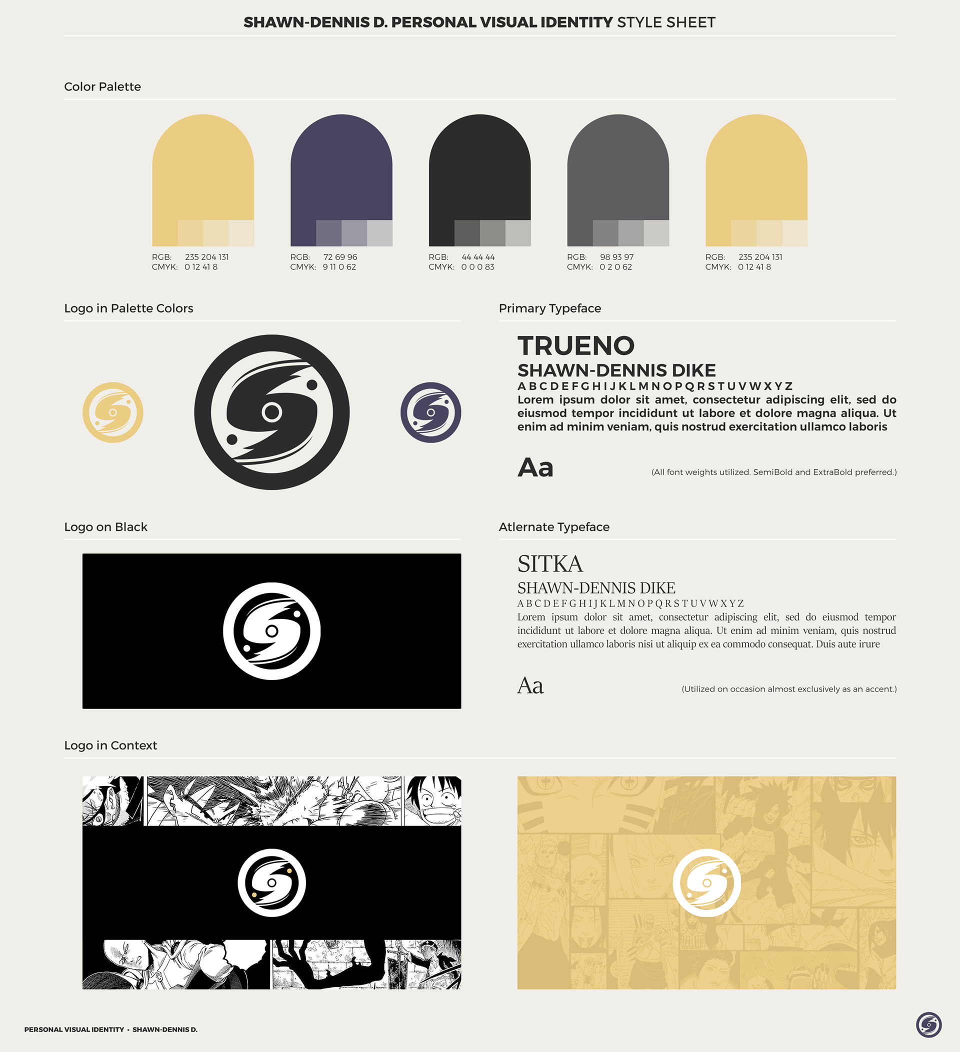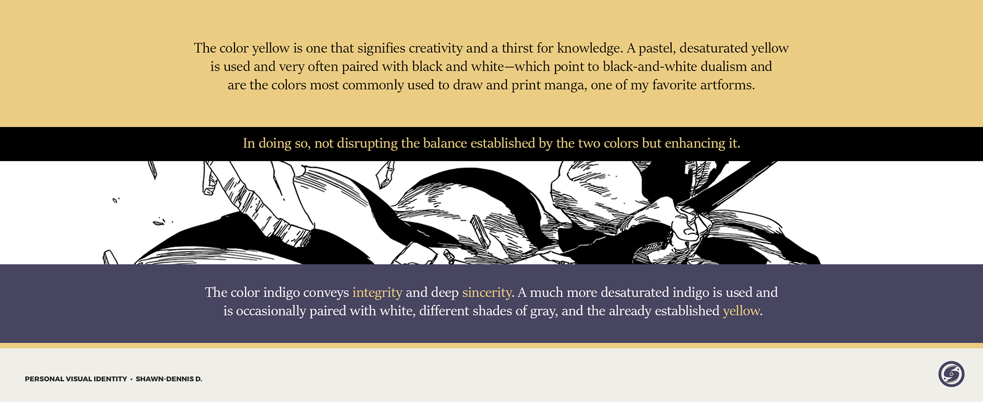My personal visual identity is the manifestation of my unwavering devotion to creating and helping make the world a bit easier to understand. It has been developed over the course of several years as I matured and learned more about myself and the world. What it is now is a representation of who I am, both as a creative and at my core. I am very passionate about finding inspiration in people, works of art, and everyday life. That energy plays a key role in shaping my visual identity and influences many of my practical design decisions and creative sensibilities.