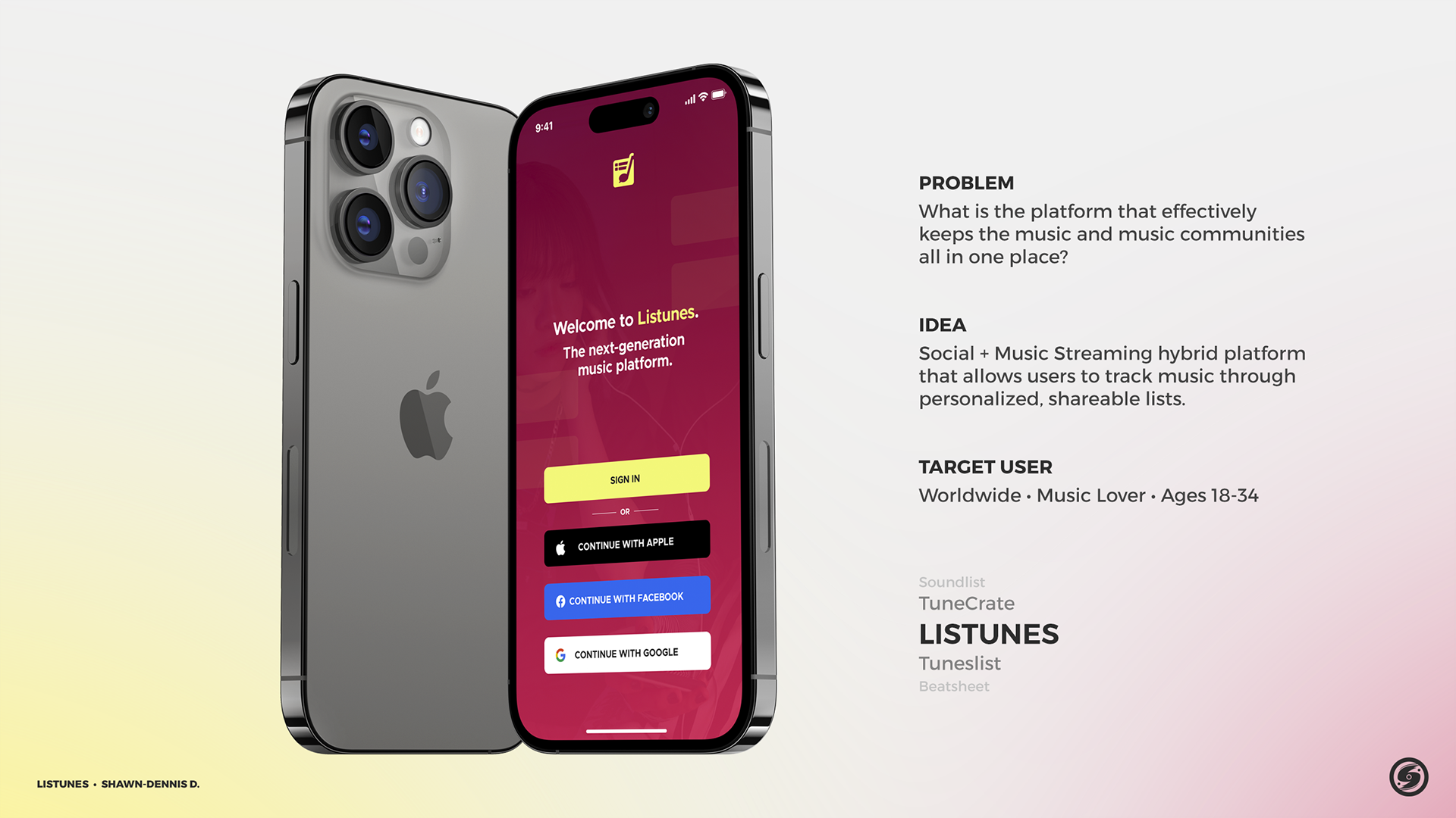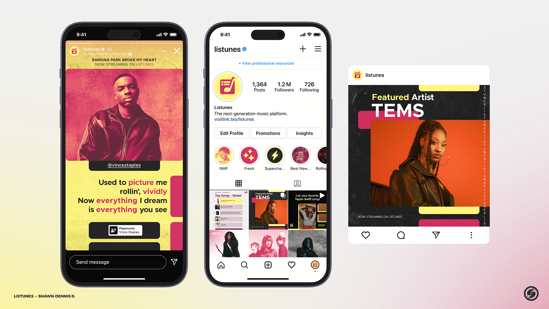 Listunes is a music streaming, discussion, and social cataloging service. In addition to giving users access to millions of songs from creators all over the world, it also features tools that allow users to curate music playlists, as well as track and record their music listening history. Additionally, it offers a variety of community services within the platform, such as live chats, discussion threads, and following feeds. Listunes stands out in the market with a bold yellow-magenta color palette designed to reflect energy, creativity, and a sense of youth. The logo highlights the standout feature of the platform: listing and tracking music. This is accented with a quarter note, perhaps the most common note type in music. The contained aspect of the logo gives the brand a reliable, organized feel. In addition, the angling of the quarter note forms a “music cart” of sorts, reinforcing the concept of curating music playlists, while the cheeky addition of a speech bubble tail injects a sense of enthusiasm around music community discussion and interaction. Listunes is a self-initiated concept.
